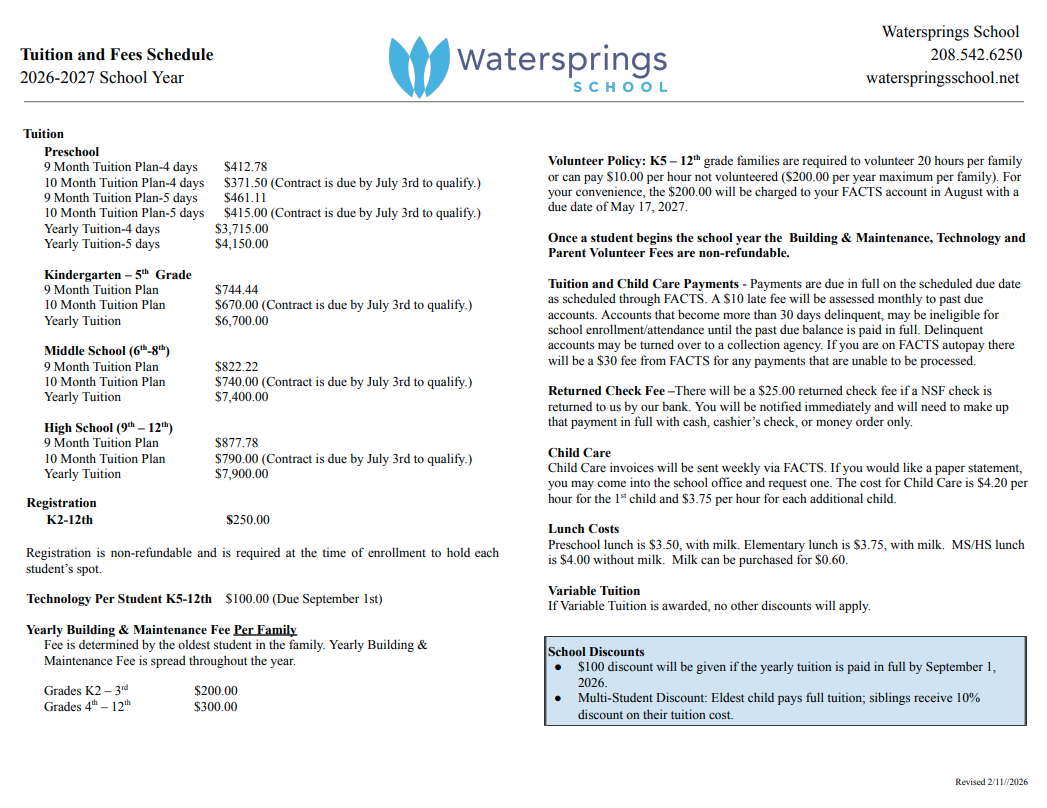 K5 – 12th grade families are required to volunteer 20 hours per family or can pay $10.00 per hour not volunteered ($200.00 per year maximum per family). Volunteer hours can be served during school functions (recess duty, lunch duty, library, etc.), fundraisers, and Watersprings sporting events/activities. For your convenience, the $200.00 will be charged to your FACTS account in August with a due date of May 18, 2026. Once the 20 hours are completed, the $200.00 will be credited to your account.